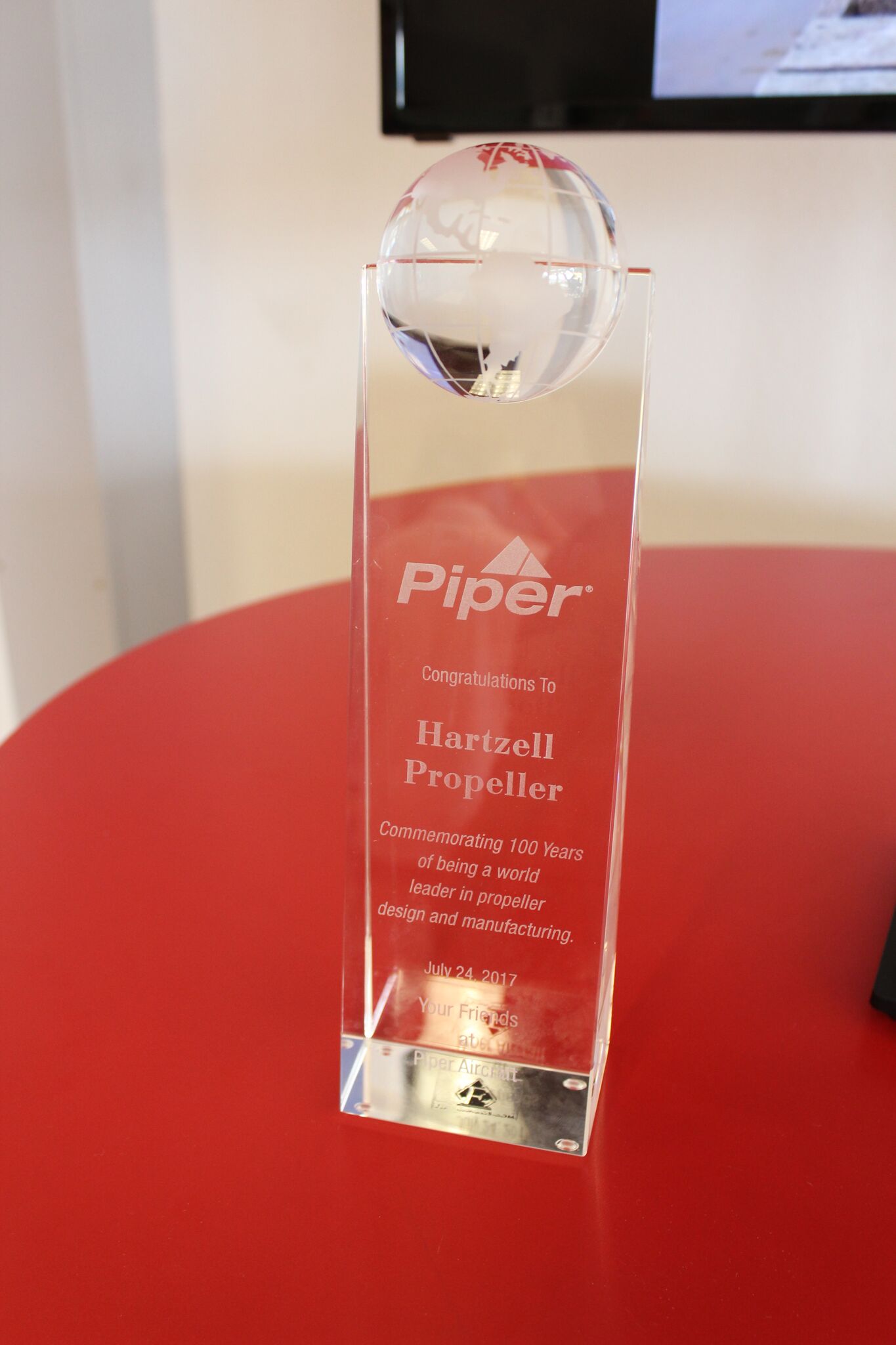 Another special moment at Oshkosh was commemorating both Hartzell and Piper’s anniversaries at our fifth annual Props and Hops event on the first evening of AirVenture 2017. Piper presented Hartzell President Joe Brown with a lovely award of recognition, which you can view below. Congratulations, Piper Aircraft, on the 80th anniversary of the Piper Cub. We wish you many more years of aviation innovation!